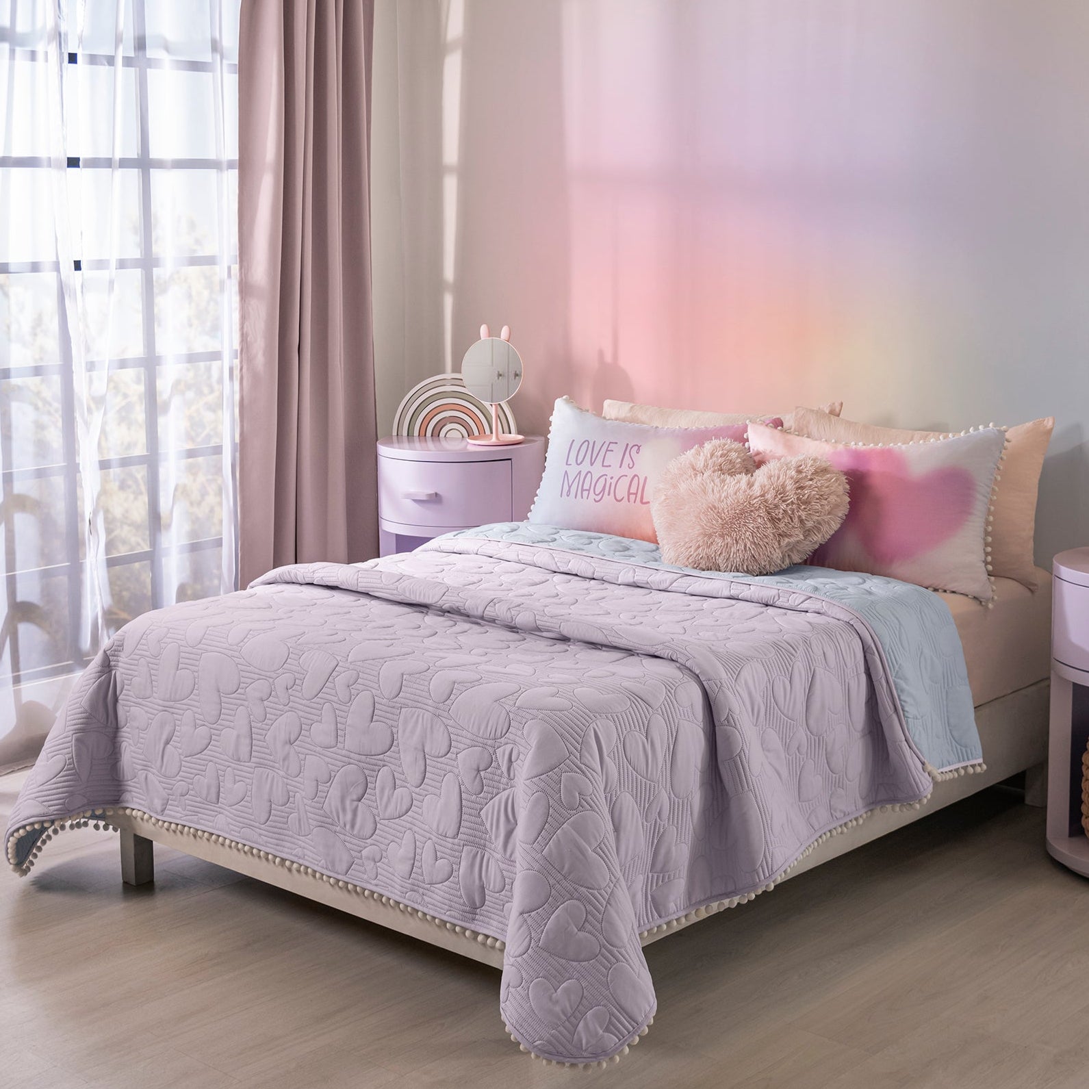 Descubre la magia del amor con el edredón Love y transforma tu dormitorio en un espacio a la moda. Su orilla de pompones y su cojín en forma de corazón te harán amarlo.