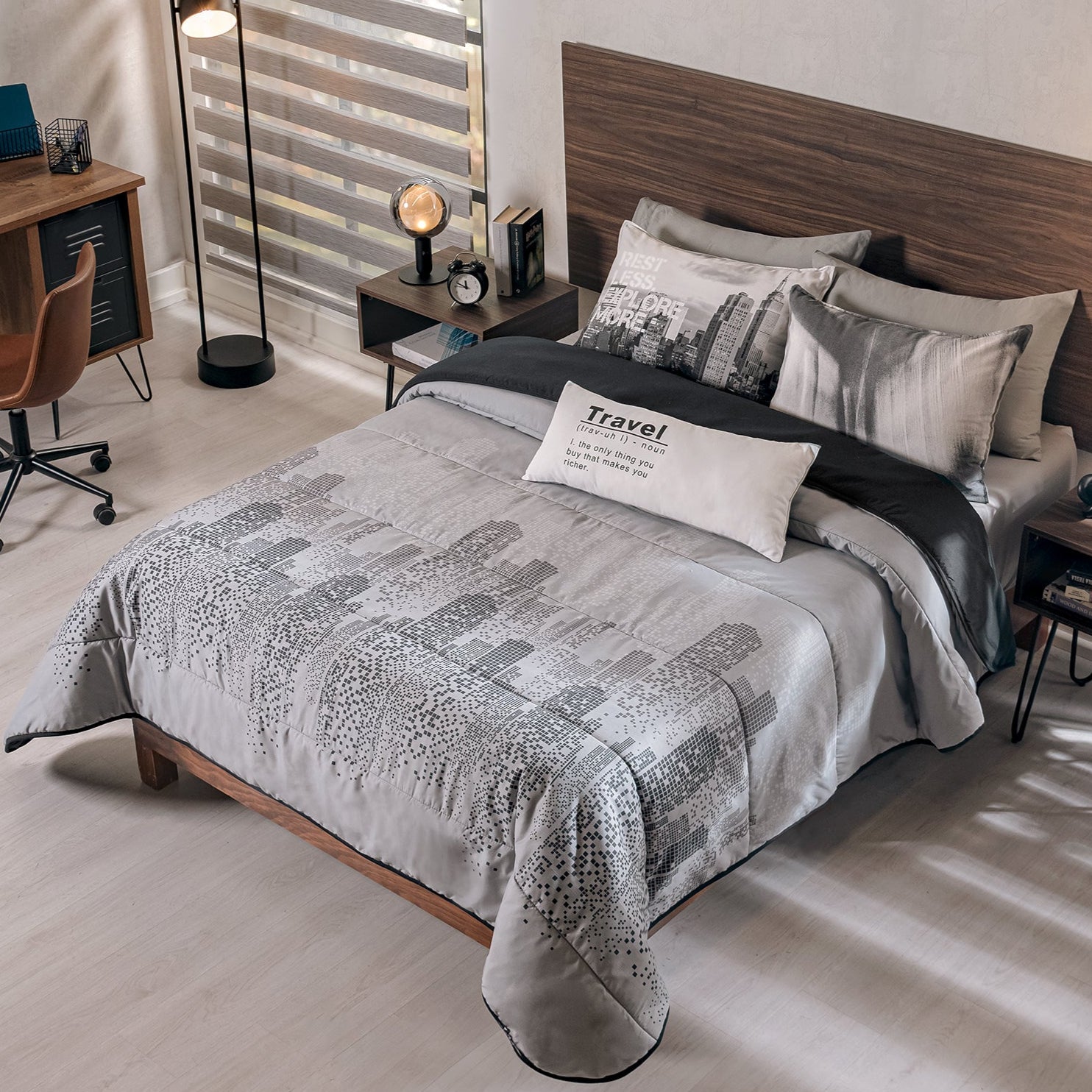 El juego de edredón City es perfecto para darle un toque urbano a la habitación, inspirando sueños de viajes y descubrimientos. Ideal para jóvenes que buscan un estilo moderno y lleno de personalidad.