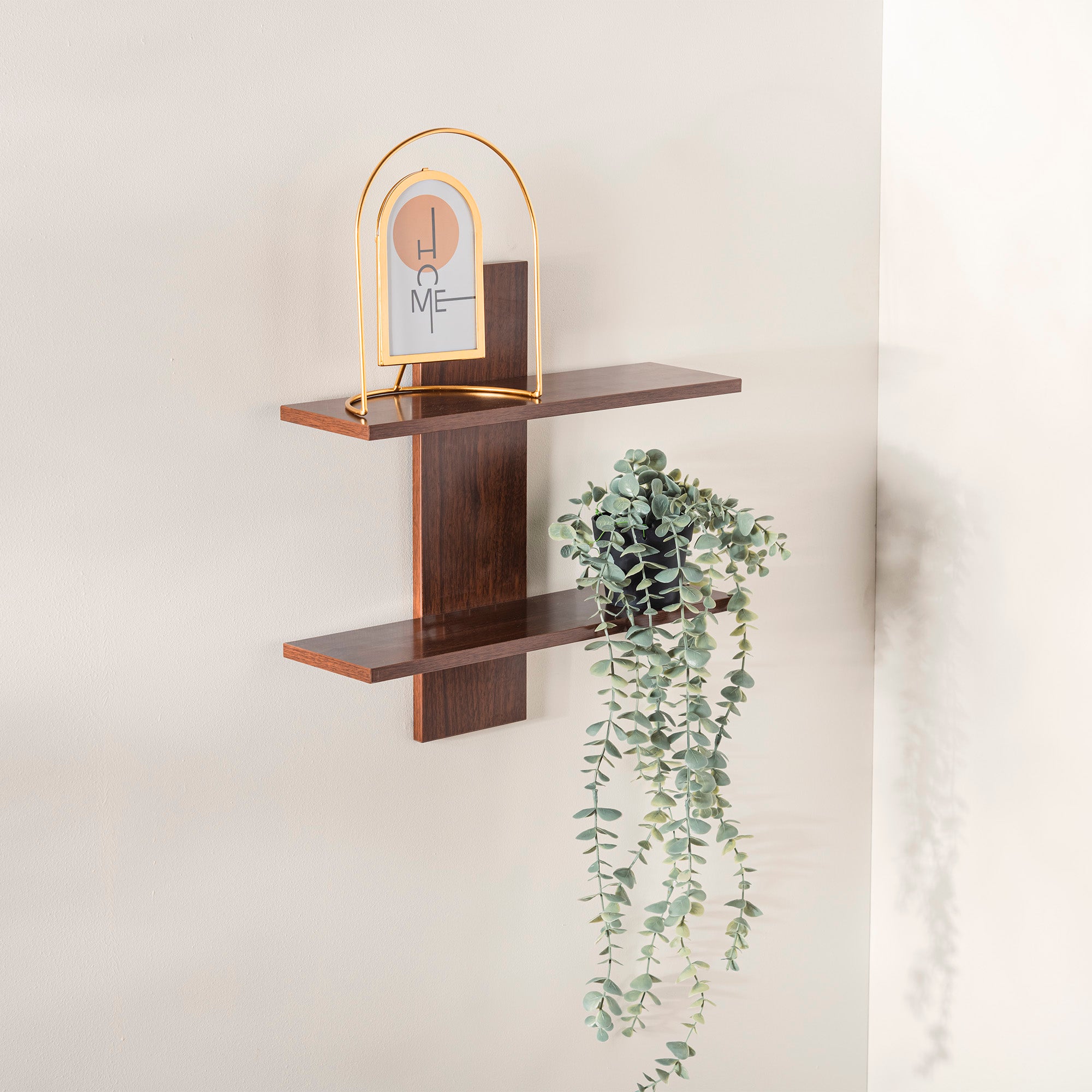 Repisa de dos niveles y acabado en nogal, aporta profundidad y dinamismo a cualquier espacio. Ideal para exhibir tus objetos favoritos.